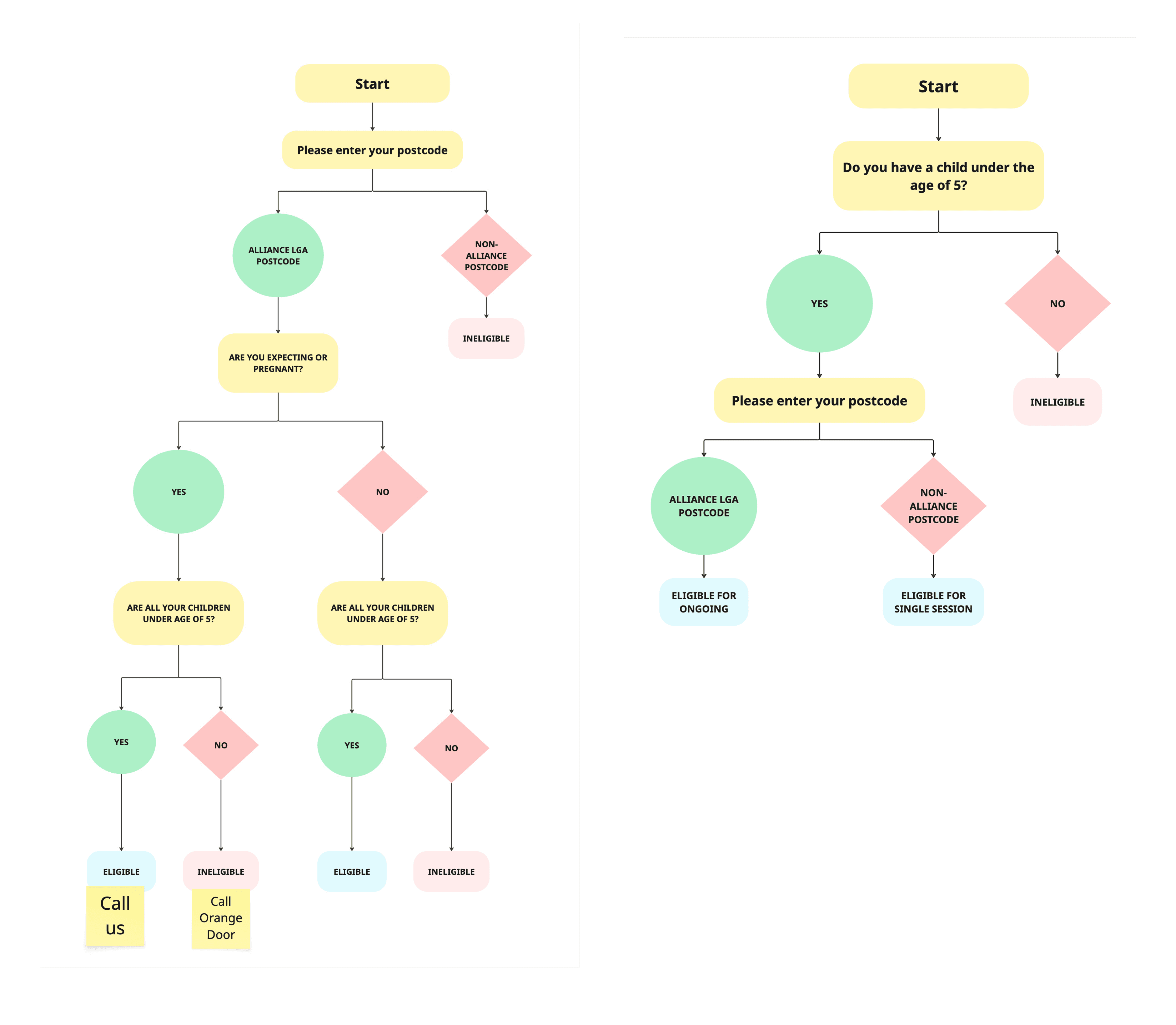 I ran a collaborative workshop and asked Program Coordinators and Head of Impact to map out loose decision trees that demonstrated the logic of the eligibility criteria they used to assess inquiring families for each of their services.