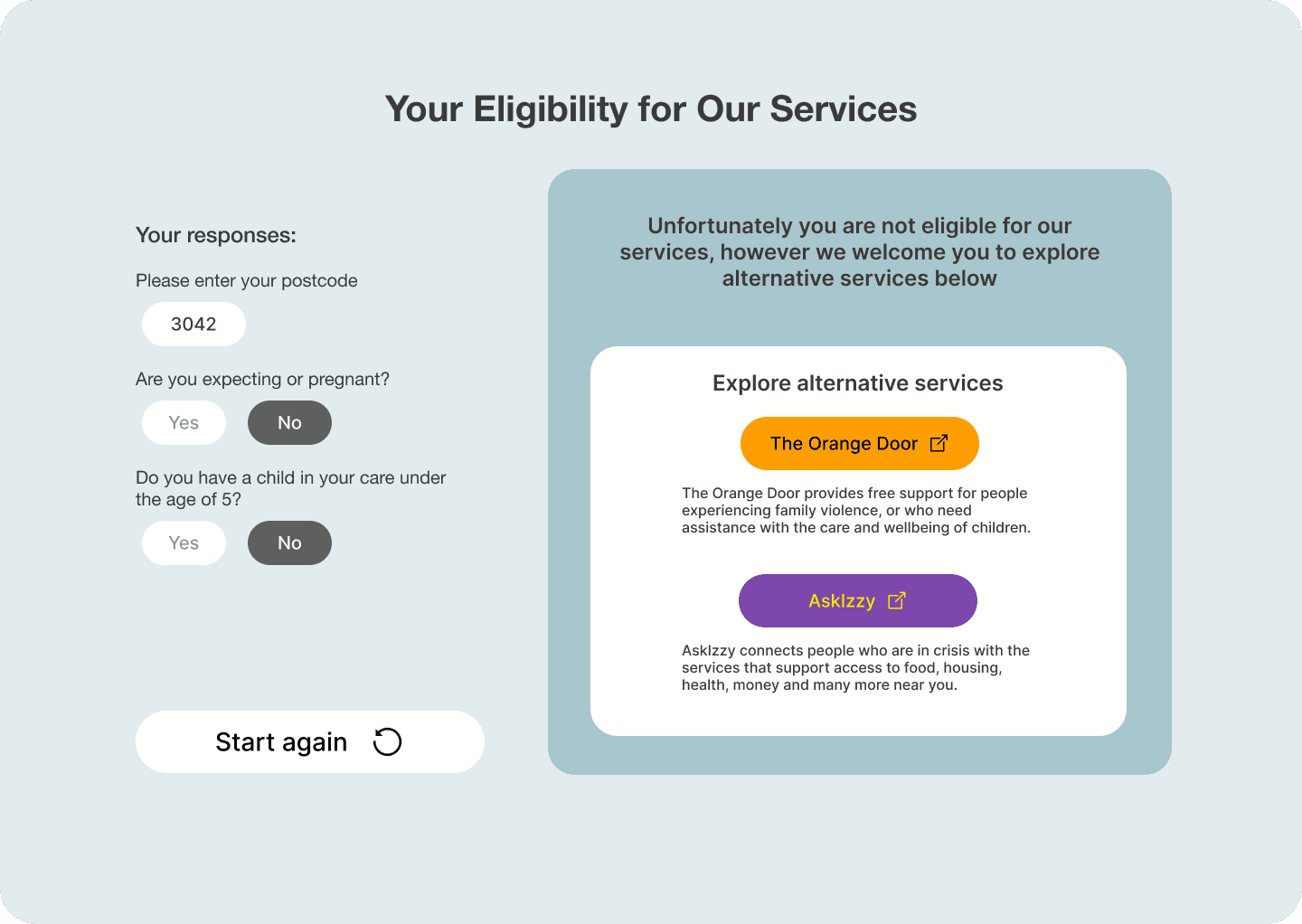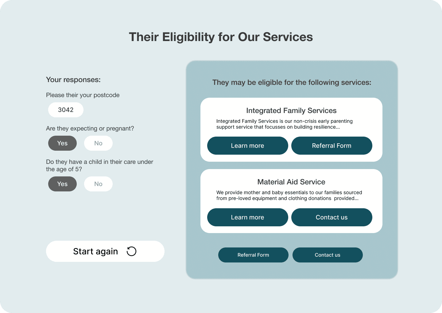 I designed an interactive eligibility screening tool that filters ineligible inquiries with two - four questions in lay-man terms, using input to gate referral form access, and centralises all referrals to a single team-accessible point — dramatically reducing organisational burden while connecting ineligible families to appropriate alternative services.