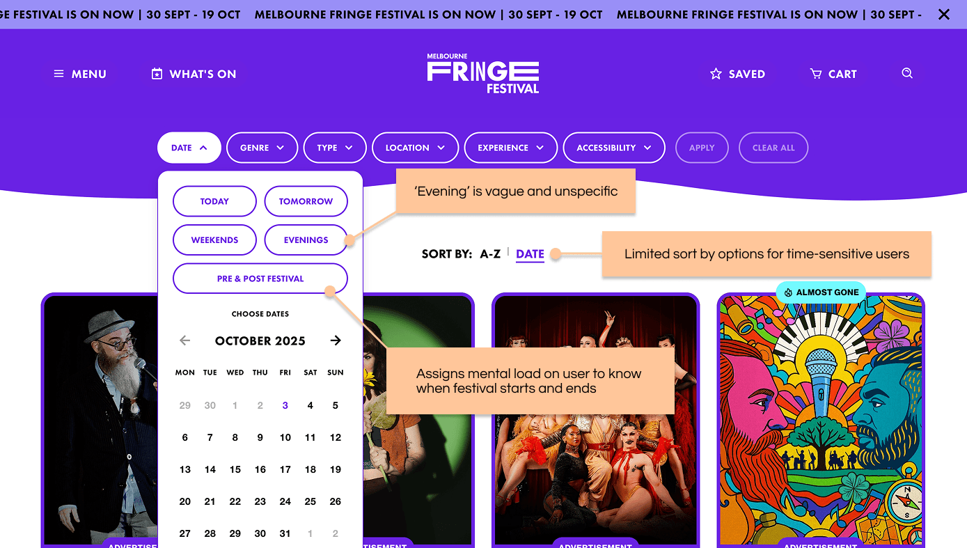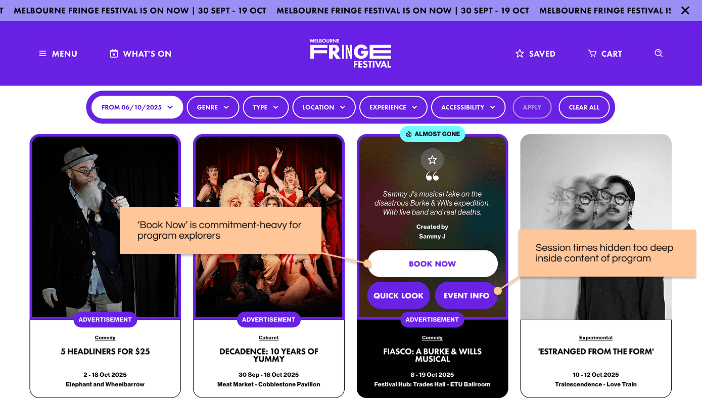 I analysed arts and culture venue websites such as Arts Centre Melbourne and local city venues, however I found that many of them suffered from the same issue as Fringe.
