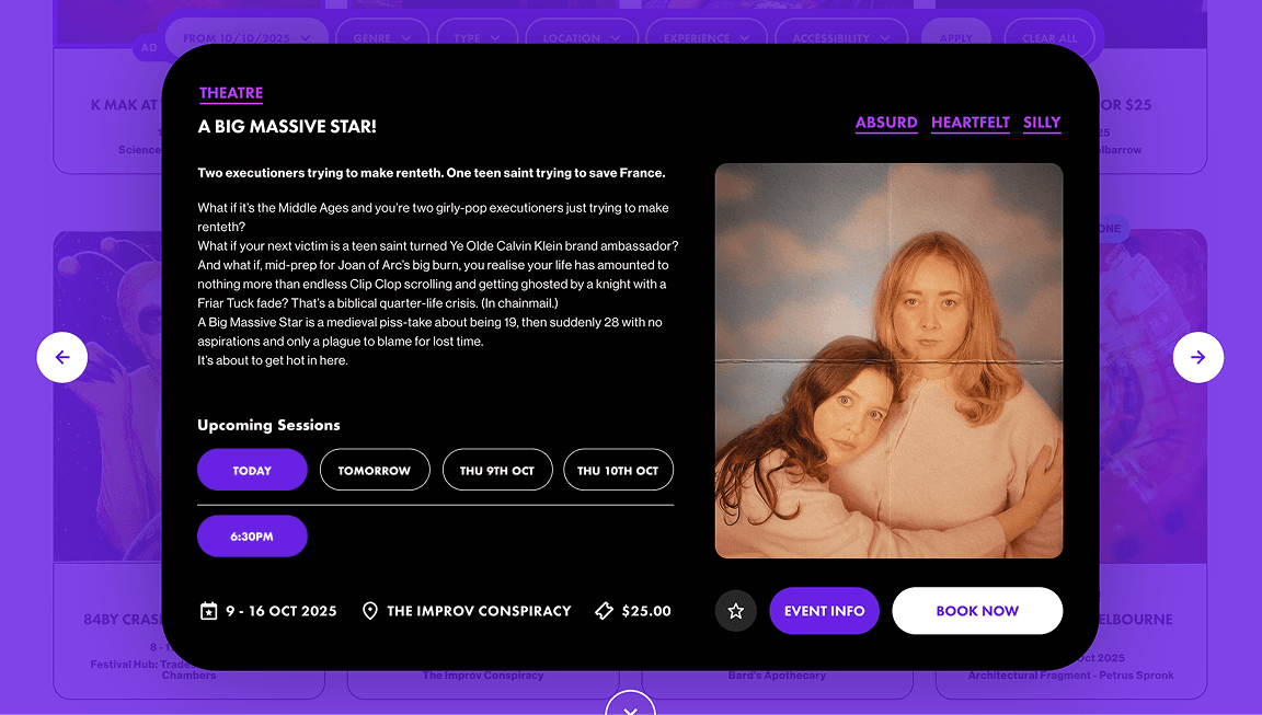 Whilst volunteering as an Access Champion at this year's Fringe Festival, I noticed a problem with the website's program browsing experience thanks to a conversation I had with two other volunteers who were interested in attending shows before or after their shifts, but found the program browsing experience inefficient and tedious.