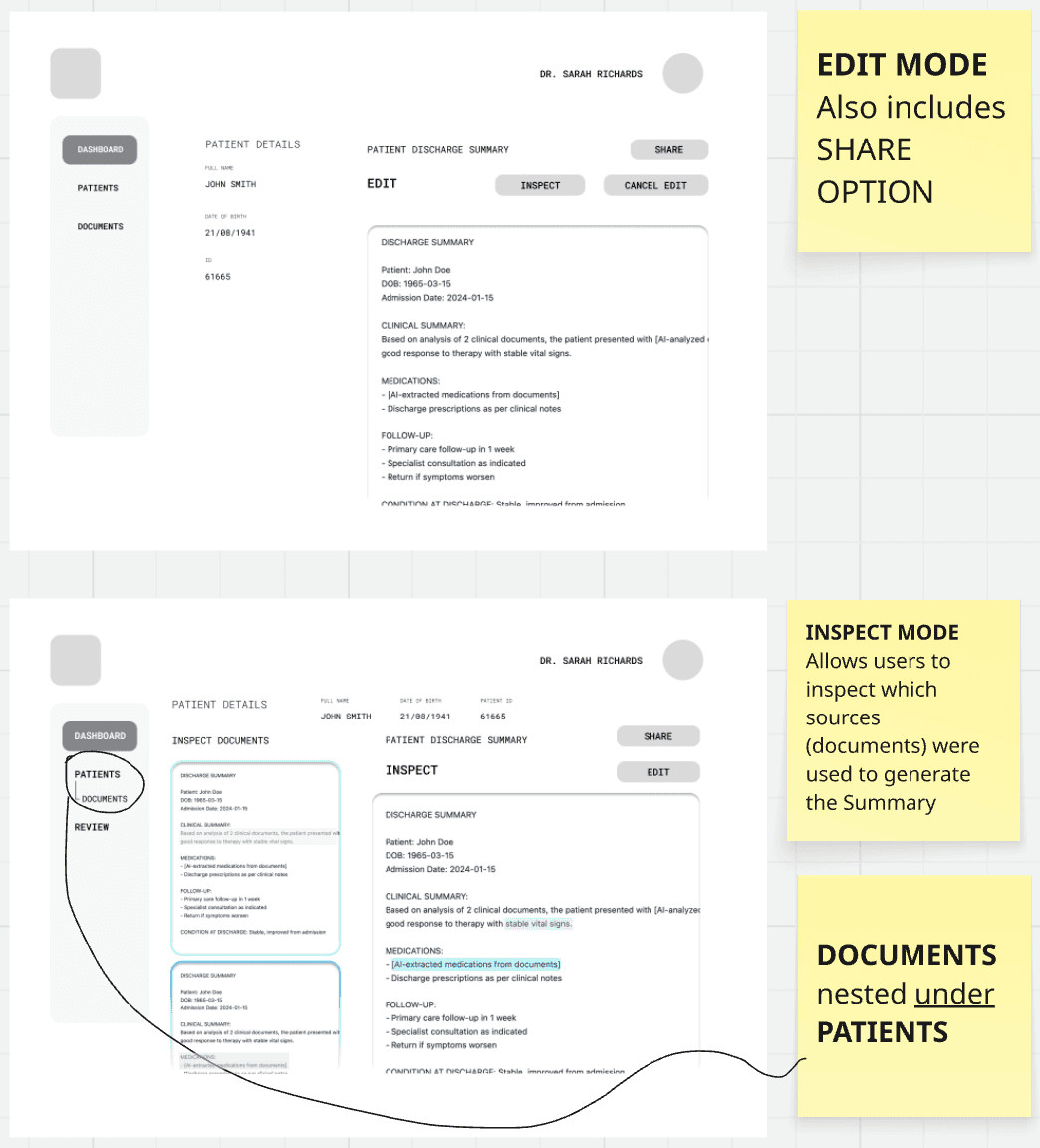 In order to address this issue of trust and accuracy, as much as possible for users, I designed an 'Inspect' Mode where users could inspect the source document of statements generated in the Patient Discharge Report and accordingly, make edits in 'Edit' Mode.